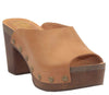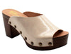 - Faux wood midsole and heel